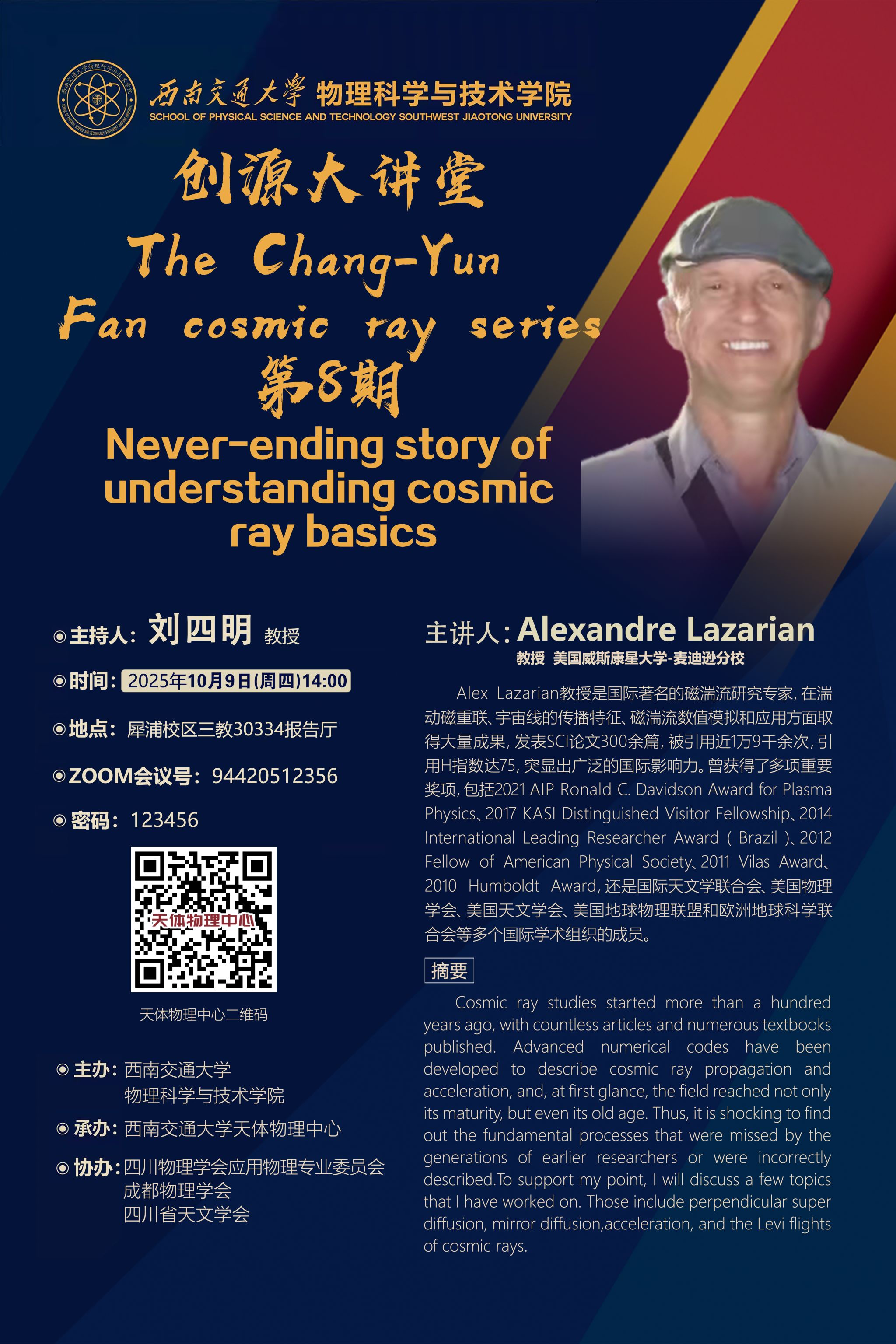 Alex Lazarian教授是国际著名的磁湍流研究专家,在湍动磁重联、宇宙线的传播特征、磁湍流数值模拟和应用方面取得大量成果,发表SCI论文300余篇,被引用近1万9千余次,引用H指数达75,突显出广泛的国际影响力。曾获得了多项重要奖项,包括2021 AIP Ronald C. Davidson Award for Plasma Physics、2017 KASI Distinguished Visitor Fellowship、2014 International Leading Researcher Award (Brazil)、2012 Fellow of American Physical Society、2011 Vilas Award、2010 Humboldt Award,还是国际天文学联合会、美国物理学会、美国天文学会、美国地球物理联盟和欧洲地球科学联合会等多个国际学术组织的成员。